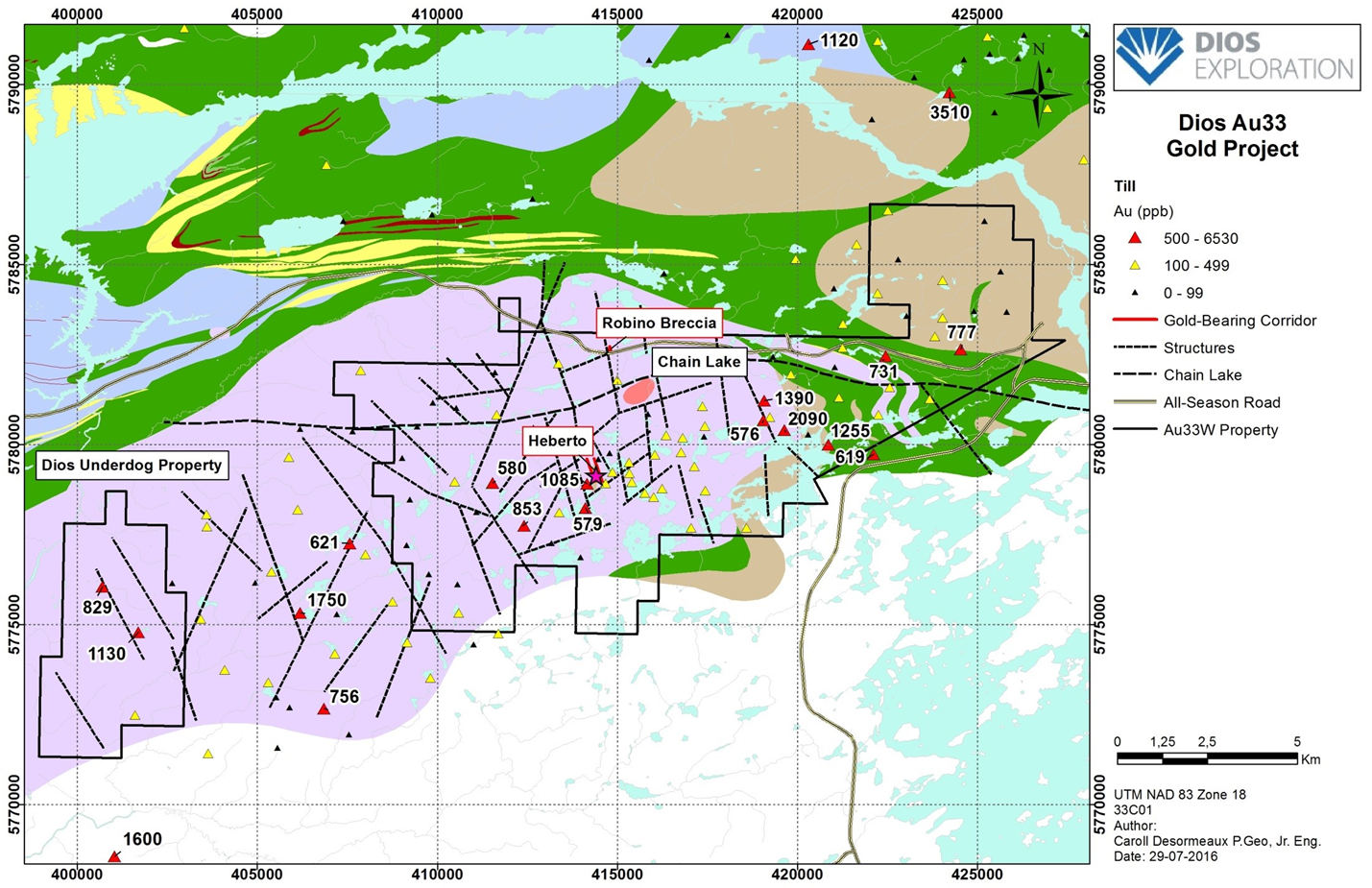 Montreal, Quebec, Canada –Dios Exploration confirms receipt of ATI–Authorizations for Impact Exploration Work covering drilling and stripping activities on wholly-owned AU33 gold project hosting Heberto discovery, Eeyou Istchee James-Bay, QC.