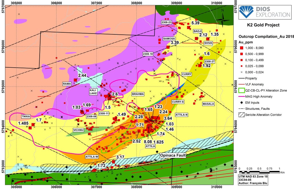 Montréal, Québec –DIOS EXPLORATION INC. annonce les résultats du traitement des données d’un levé de polarisation provoquée complété sur un réseau de 3.2 km de long par 700 m-1.1 km de large (avec des lignes espacées aux 200 m) pour mieux définir les forages de Wi-Target sur le projet d’or K2 situé dans la région du lac Elmer, en territoire Baie James Eeyou Istchee au Québec.