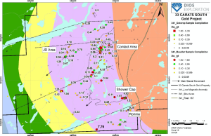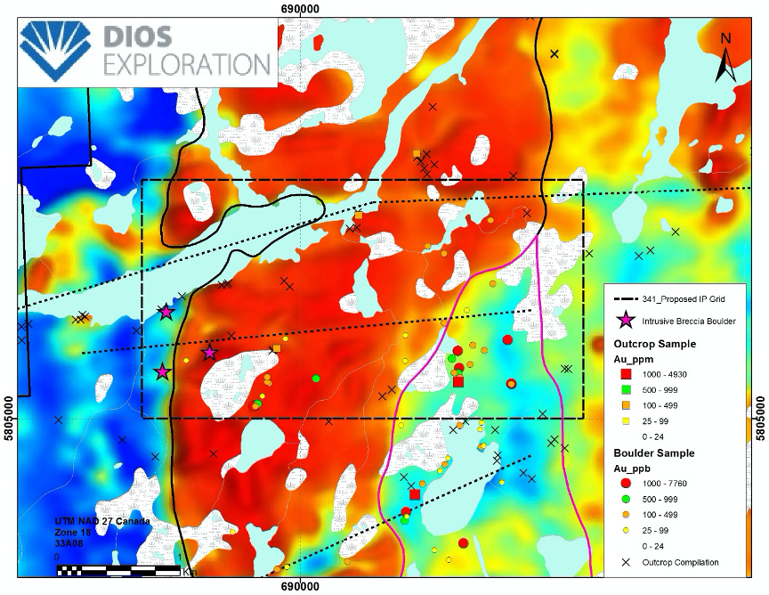 Un tel continuum entre contextes intrusifs (profond) et volcaniques (en surface) est bien documenté dans le monde. La tonalite se caractérise par une vaste carbonatisation. Dios a identifié plusieurs indices d’or et cuivre le long de linéaments de creux magnétiques (NNO) sur le projet 33Carats (incluant Contact Est= 3,18 g/t Au, Laker= 3,1 g/t Au et Shower Cap= 6,11 g/t en or). La minéralisation est typiquement composée de 1-3 pourcent de pyrite et/ou chalcopyrite (disséminée ou en filonnets/veines) et fréquemment associée à des dykes intermédiaires. Des brèches et altérations potassiques (biotite et feldspath potassique) et propylitiques (chlorite, épidote et calcite) sont localement observées et sont typiques d’environnement porphyrique. Un levé géophysique (polarisation provoquée) est fortement recommandé pour mieux définir les cibles de forage.