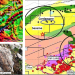 Dios discovered Badji showing (5.39 g/t gold, 111 g/t silver, 5.05% copper, 93 ppm bismuth) consisting of pyrite-chalcopyrite centimetric stringers in foliated strongly sericitized dacite, a few km NE of a major mineralized system: a gold-copper-silver bearing volcanic dome on top of a large porphyry, itself on top of Kali intrusion.