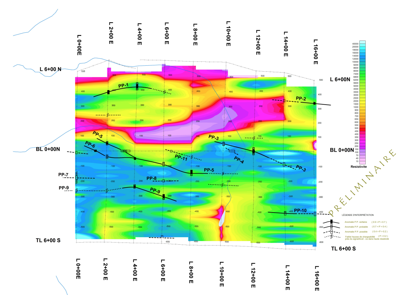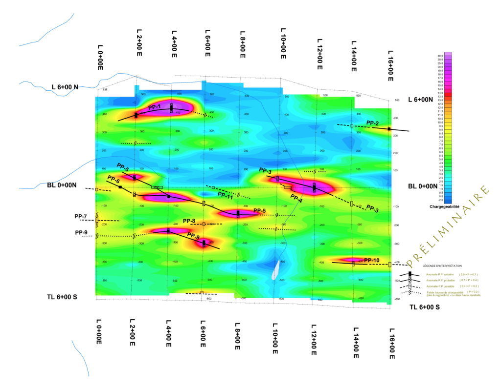 Strong 400 m PP-1 is associated with sulfidic mineralization in a magnetic gabbro including SDBJ showing (1.08 % copper, 13.8 g/t silver, .410 g/t gold). These gabbro plugs have to be prospected.