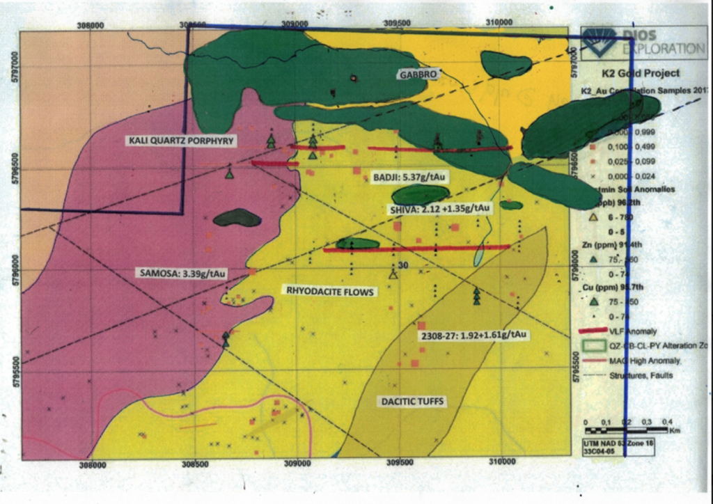Montreal, Quebec, Canada –Dios Exploration is very pleased to report ground induced polarization IP survey is completed on northeastern K2 property and reveals significant preliminary results in volcanic rocks intertwined with small gabbro plug series, 9-10 km SW of Patwon discovery, along prospective shear zone gold corridor.