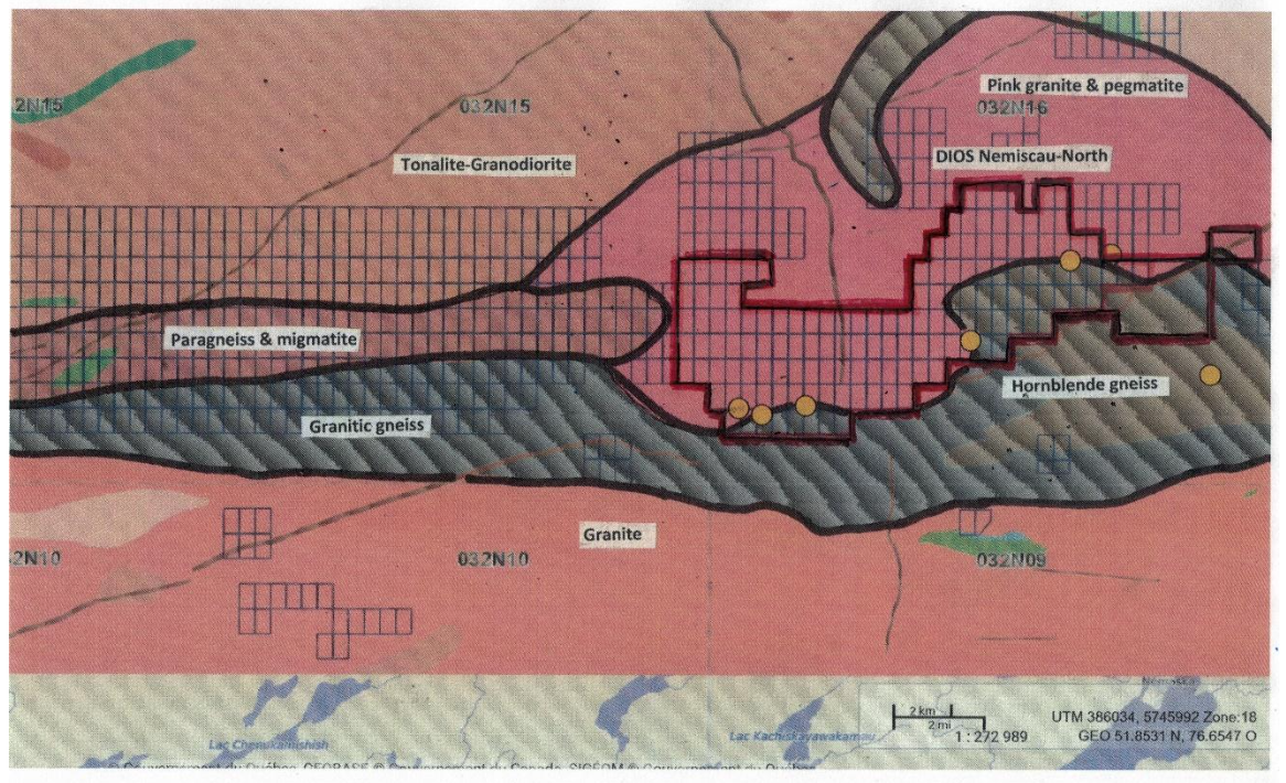 Montréal, Québec, Canada – DIOS Exploration acquiert la propriété Nemiscau-Nord Lithium batterie métal composée de 164 claims pour 9274 hectares le long de la Rivière Pontax, à environ 15km au nord du village Cree de Nemaska en Eeyou Istchee Baie James, un secteur avec dépôts connus de lithium au centre du Québec. Le projet est adjacent à l’est des claims du Moyenne Trend lithium de LI-FT Power/Kenorland et à l’ouest de claims de Brunswick Exploration et régionalement entre les projets de lithium Pivert-Rose de Critical Elements Corp., du gisement Wabouchi de Nemaska Lithium et du prospect Pontax-Li de Stria(Cygnus).