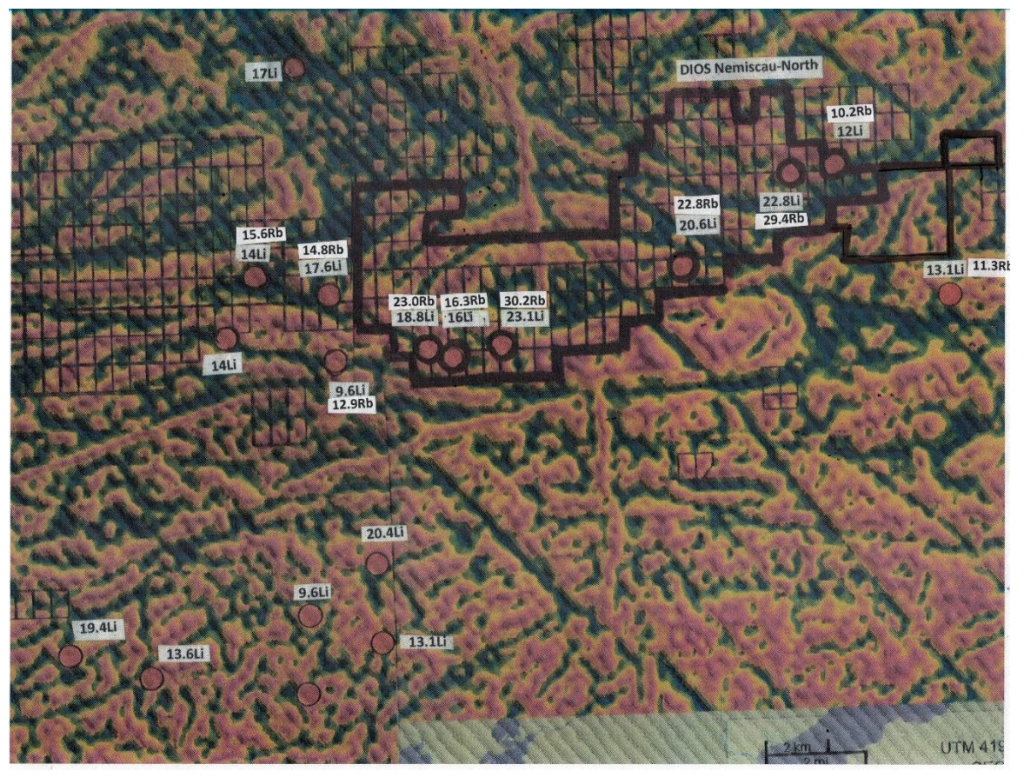 La signature géochimique est comparable à celle observée à Pivert-Rose et Pontax-Lithium, avec des valeurs plus élevées dans l’environnement secondaire. Le projet Pontax-Lithium (essaims de dikes pegmatitiques riches en lithium-tantalum) fut découvert et foré avec succès par le partenariat Dios/ Ressources Sirios sous la supervision d’Harold Desbiens Géo M.Sc., V.P. de Dios & personne qualifiée selon 43-101. Des travaux de vérification sur le terrain sont prévus sur ces nouveaux claims acquis par Dios.