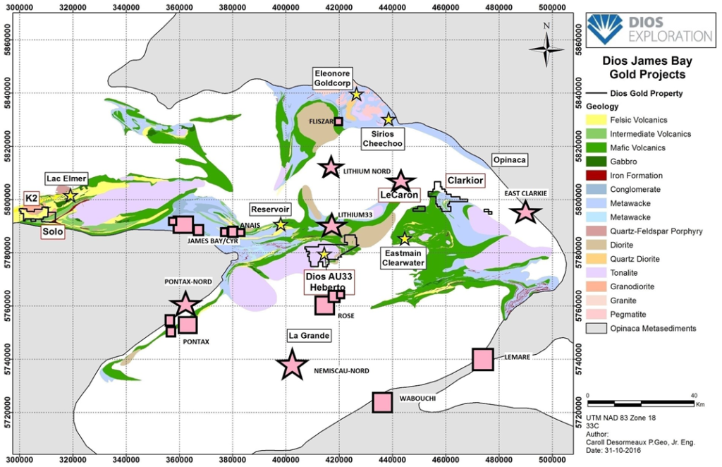 Montréal, Québec, Canada – La direction de Dios Exploration a agrandi son projet Lithium Nord (totalisant maintenant 170 claims pour 8,900 hectares; 100% Dios) situé à 12-20 km au nord de Lithium33, dans la région favorable (pour le lithium) de la Baie James, au Québec, Canada.