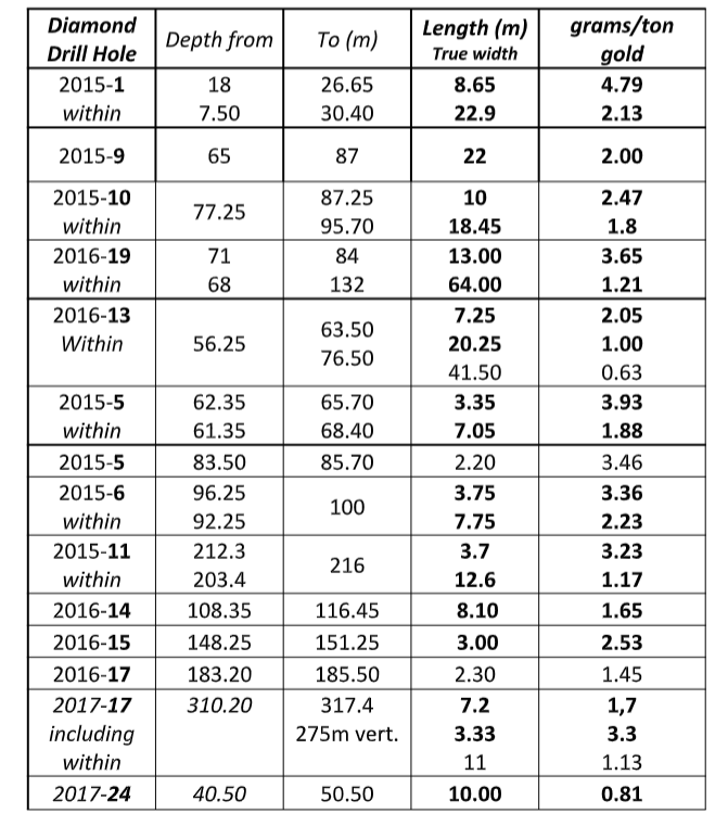 Hole 19 is 50 m south of Hole 1 (2.13g/t Au/22.9m), of Hole 9 (2 g/t Au/22 m) & of Hole10 (1.8 g/t Au/18.45 m). Hole 19 (3.65g/t Au/13m) is 112 m west of Hole 1 and 50 m north of Hole 6 (2,23g/t Au/7.75 m).