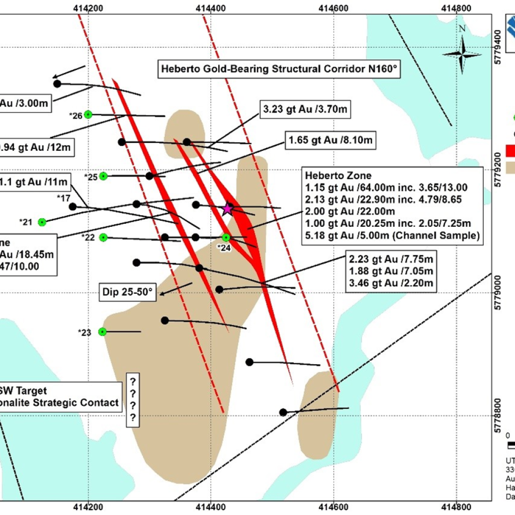 The detailed 820 kilometer-lines magnetic survey was undertaken at tree top level with 35 meter spacing and in more detailed spacing every17.5 meter on Heberto Gold and eastern extents and another target area.  Results should be available in a few weeks, to more precisely define gold targets and structural features for further diamond drilling.